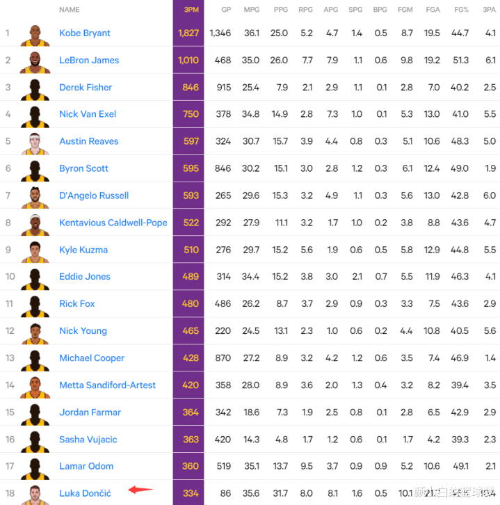 4.湖人生涯已经命中334个三分队史超魔术师升第18位;