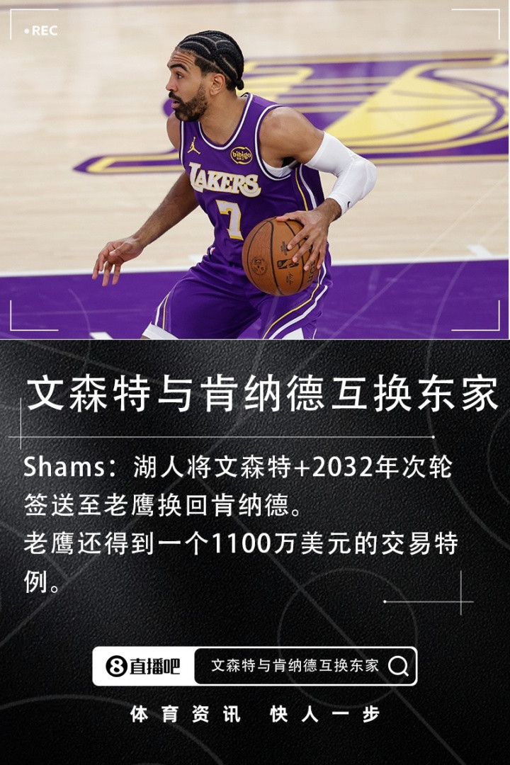 💥Shams:湖人将文森特+2032年次轮送至老鹰换回肯纳德