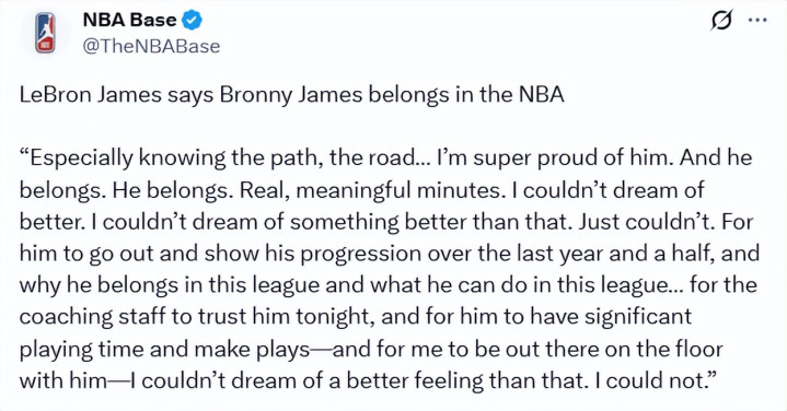 “这是真实且有意义的出场时间,没有比这更好的结果了,真的没有,”詹姆斯说道,“他走上场,我的意思是显然他……在这近一年半的时间里,他的进步有目共睹。也证明了他为什么配得上在这个联盟打球,以及他能在这个联盟做到什么。所以,教练组今晚信任他,给他大量出场时间,还让他完成了几次精彩的配合——而我能和他并肩站在球场上,这种感觉……真的没有比这更好的了,真的没有。”