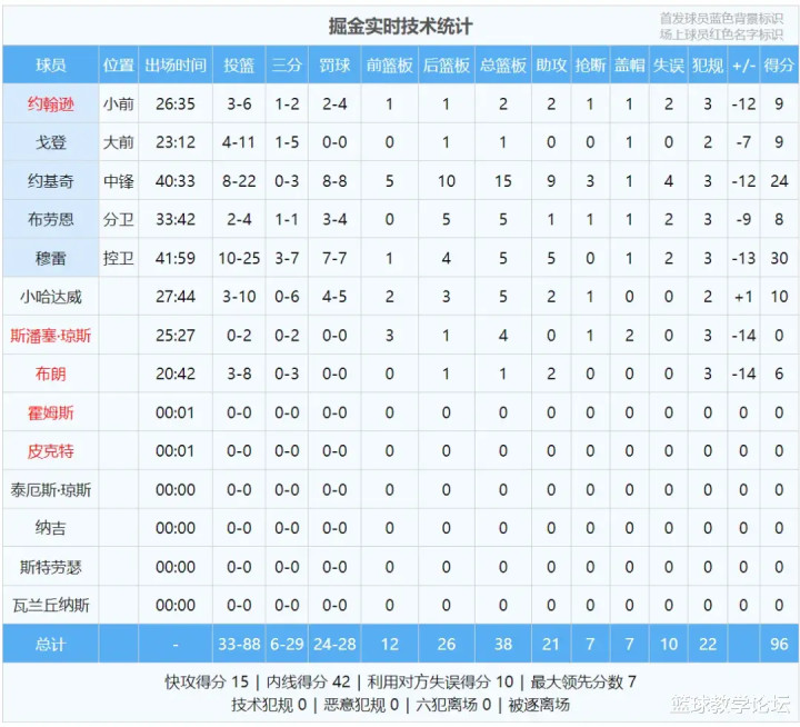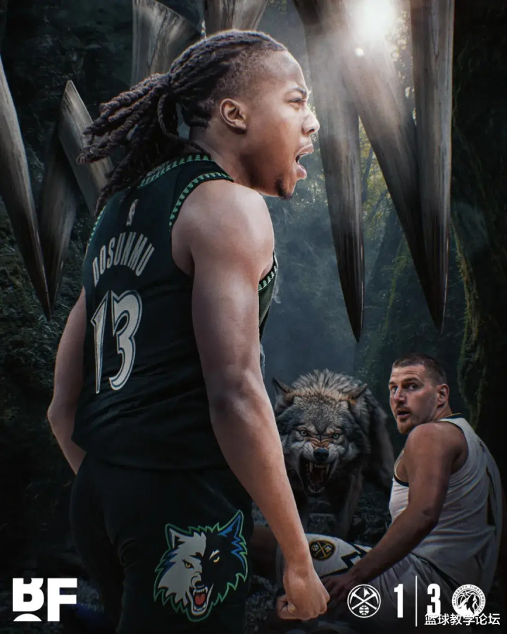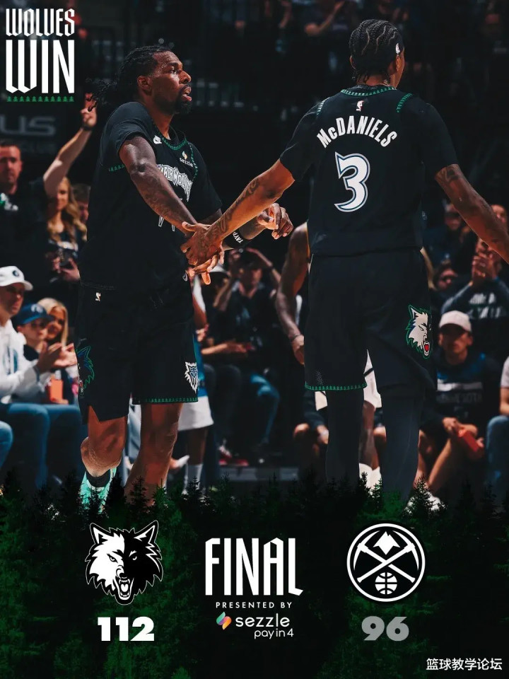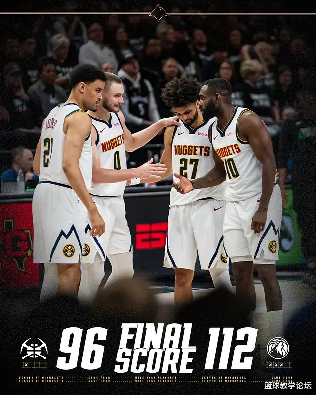 迪温琴佐和爱德华兹伤退,大家以为森林狼会输掉这场比赛,没想到他们用一场大胜夺得系列赛赛点。四节比分(掘金在前):23-22、31-28、24-32、18-30。森林狼拿出高强度防守,整个下半场,掘金全队加起来只得到42分!