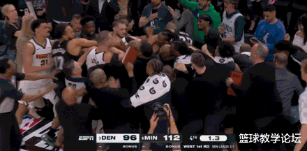 第四节还剩1.3秒,比赛大局已定,森林狼球员麦克丹尼尔斯上空篮命中。约基奇直接冲过去找麦丹理论并推搡后者,麦丹也不甘示弱,双手紧紧拽住约老师的球衣。兰德尔、布鲁斯-布朗等人加入战斗,金发美女球迷吓得躲在一旁。